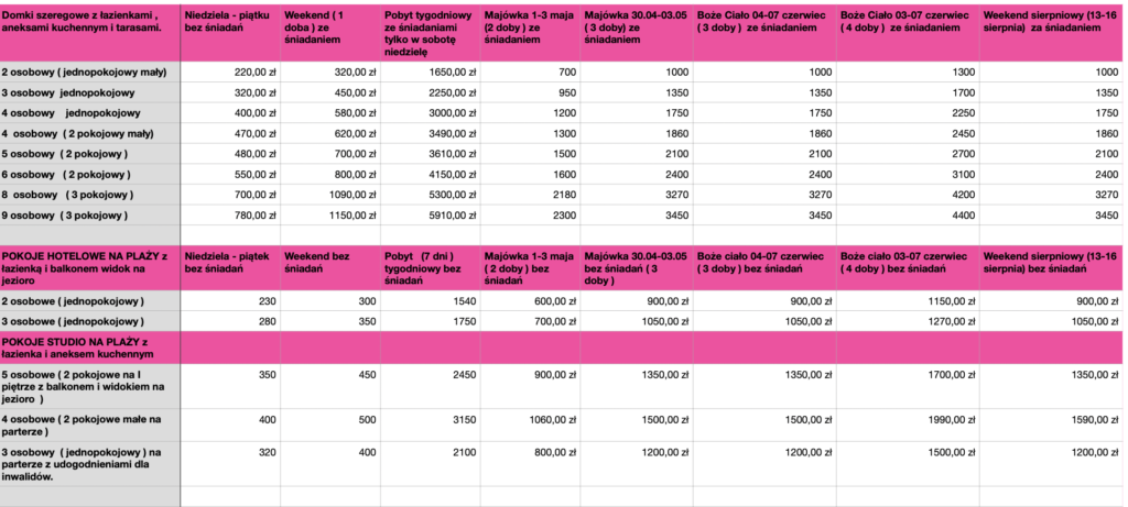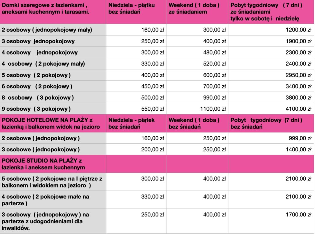 Cennik Ceny obowiązują w okresie 26 czerwca – 17 sierpnia 2026 minimalny czas wynajmu w tym okresie to 3 doby Ceny za 1 dobę za cały domek lub pokój w Domu Wypoczynkowym Cennik od 04 maja do 26 czerwca 2026 od 17 sierpnia do 30 września 2026
